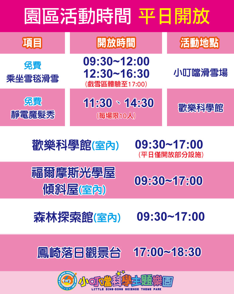 2026年3月 週一至週五 (平日) 園內活動時刻