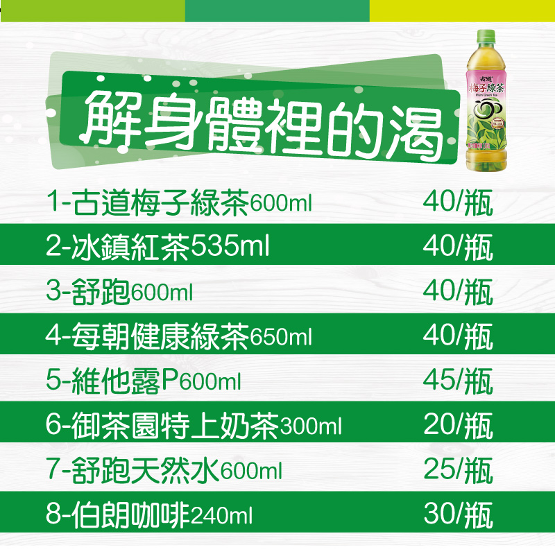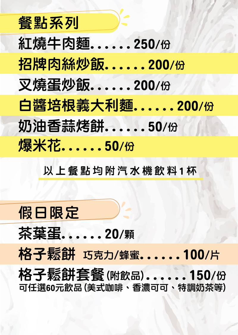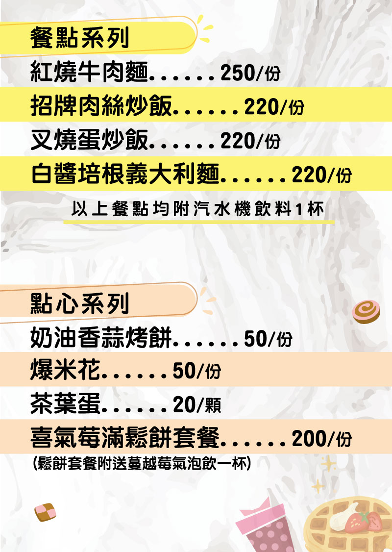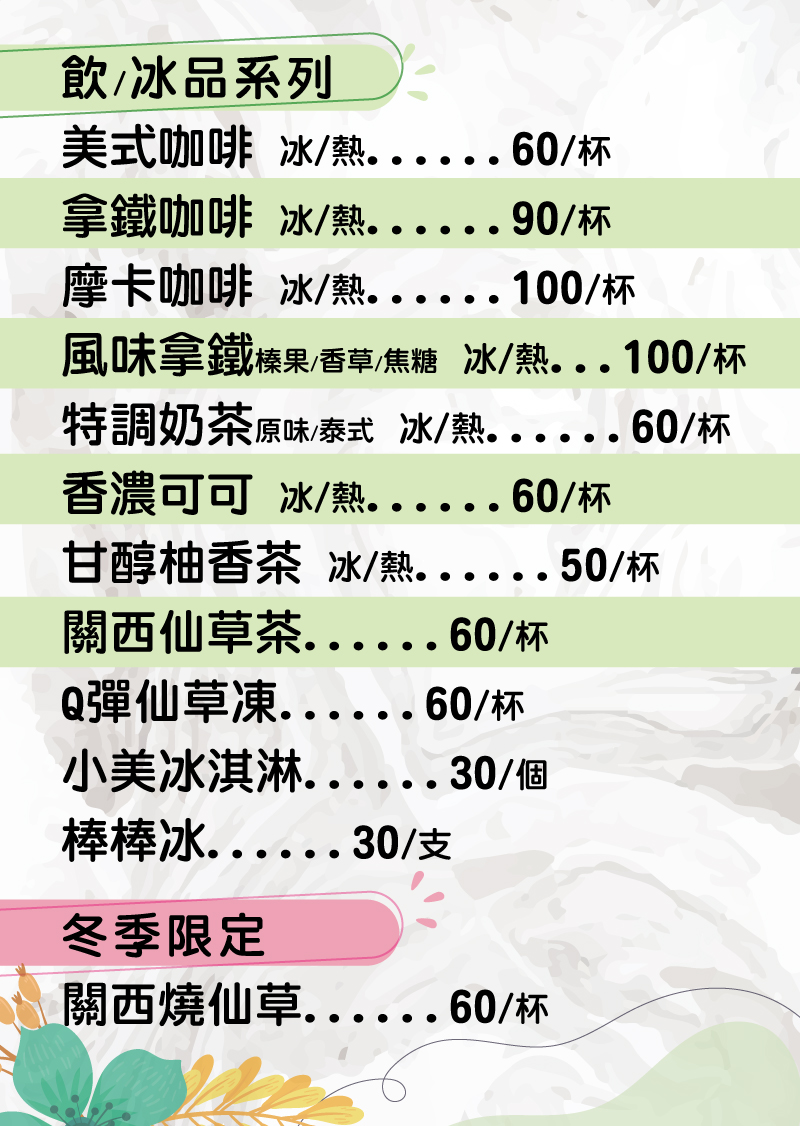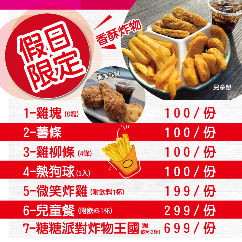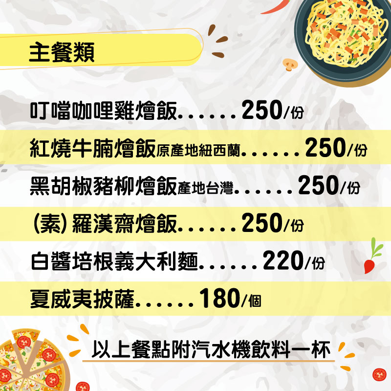 上列餐點內容、價格若有調整異動,依賣店現場說明、公告為主。