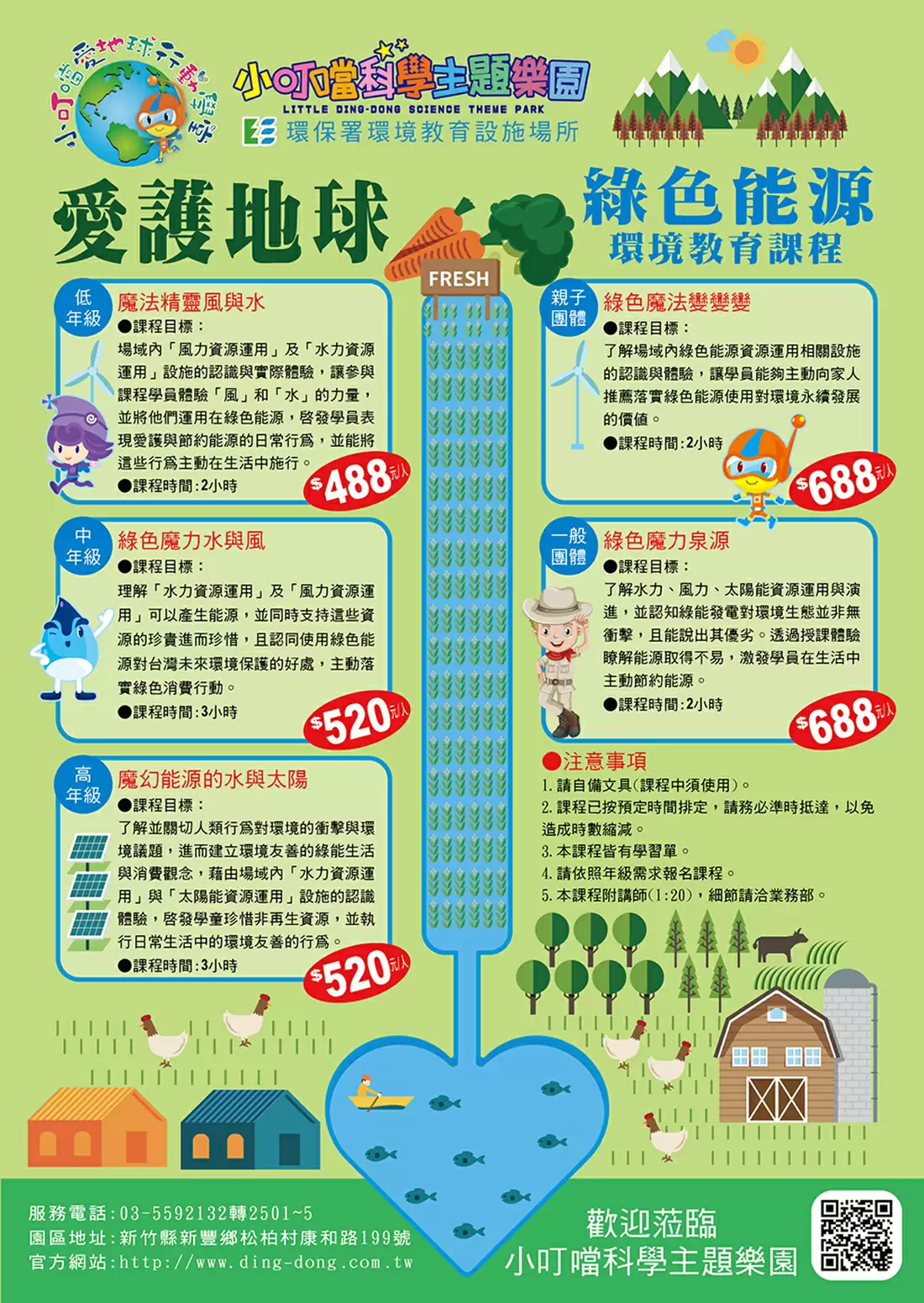 課程目標: 場域內「風力資源運用」及「水力資源運用」設施的認識與實際體驗,讓參與課程學員體驗「風」和「水」的力量,並將他們運用在綠色能源,啟發學員表現愛護與節約能源的日常行為,並能將這些行為主動在生活中施行。 |
