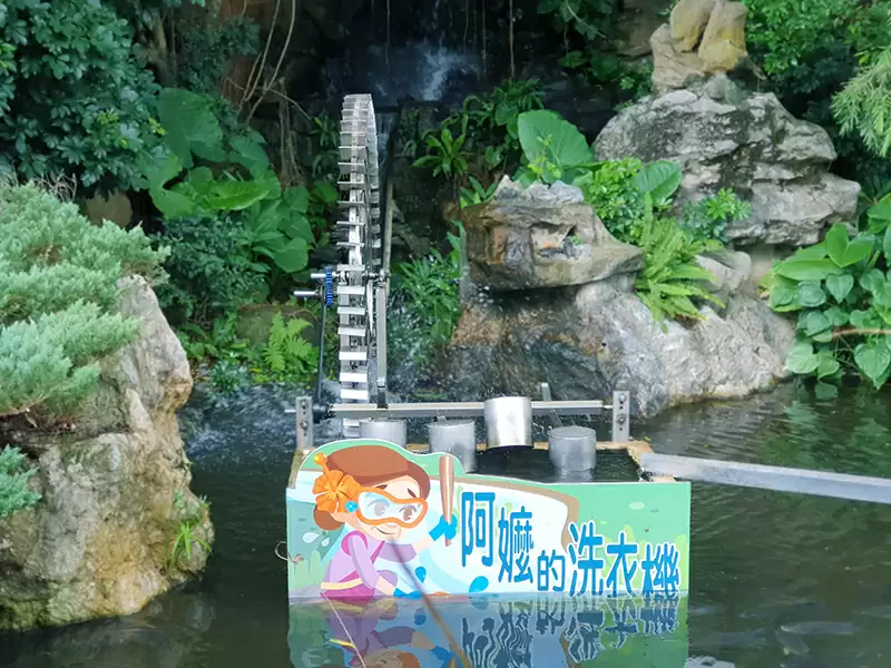 - 您知道嗎?早期農業社會,農村婦女除了在家燒飯洗衣,還要下田耕作,非常辛苦喔!在資源缺乏年代,利用地形的特性在小瀑布旁利用齒輪架設不用電的洗衣機, 就可以完成洗衣服的工作了。