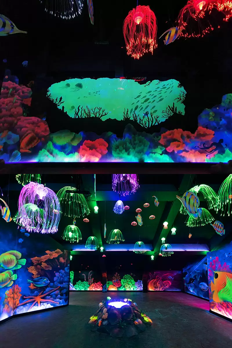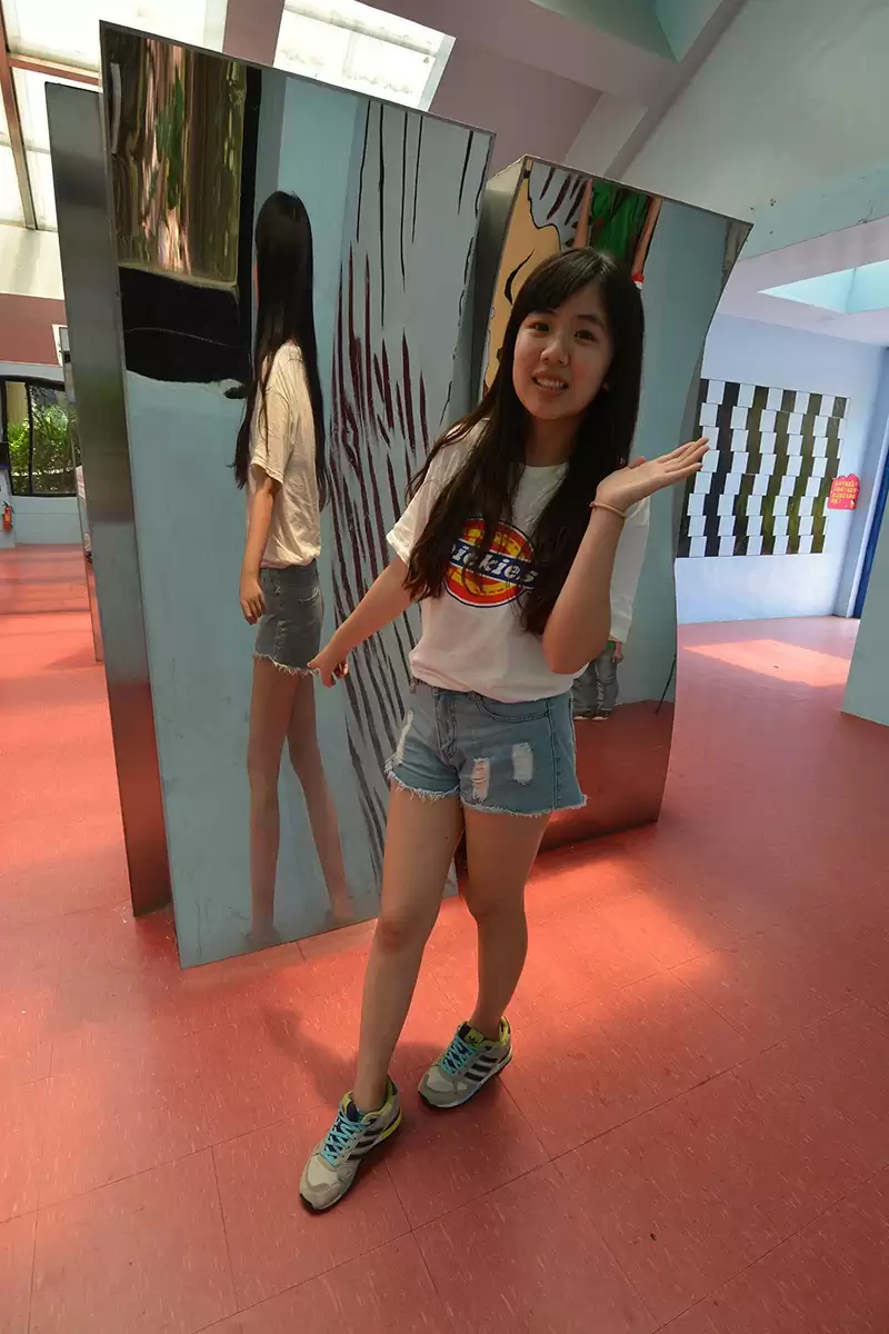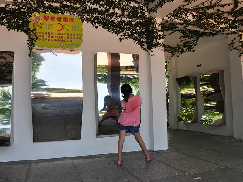 園區光學屋內的留影牆塗佈含佈”磷光材料”,當磷光牆受光時,牆面會吸收能量,無光時再慢慢釋放能量;而被人遮住的部份,因為沒吸收到光,所以會形成黑影,就是我們被定在牆上的影子。所以,是不是很神奇的光學魔術呢?