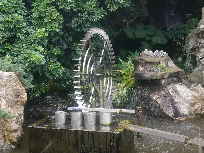 - 水车运转原理: 利用水圳水流带动叶片使水车 转动,竹筒汲水后利用 45 度角 往上旋,竹筒内水不外洒,旋转 至顶点再利用 45度角,将水倒 入梯田之集水槽。